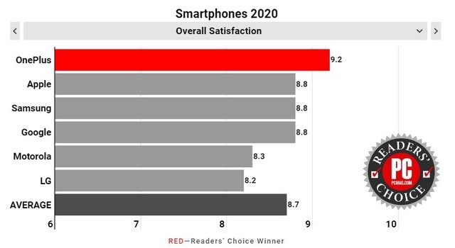 2020年3月24日,著名IT杂志PC Magazine公布了2020年度读者选择奖。在智能手机排行榜上,一加手机以9.2分的总体满意度评分位居第一,这是一加连续三年获得PCMag读者选择奖第一。