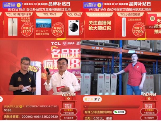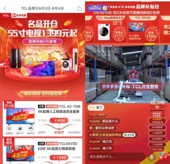 9月3日,拼多多联合TCL开启“品牌补贴日”活动。活动当天,拼多多“百亿补贴”直播间还来到家电仓储基地,与近30万网友一同“目睹”仓库货架被消费者“搬空”。