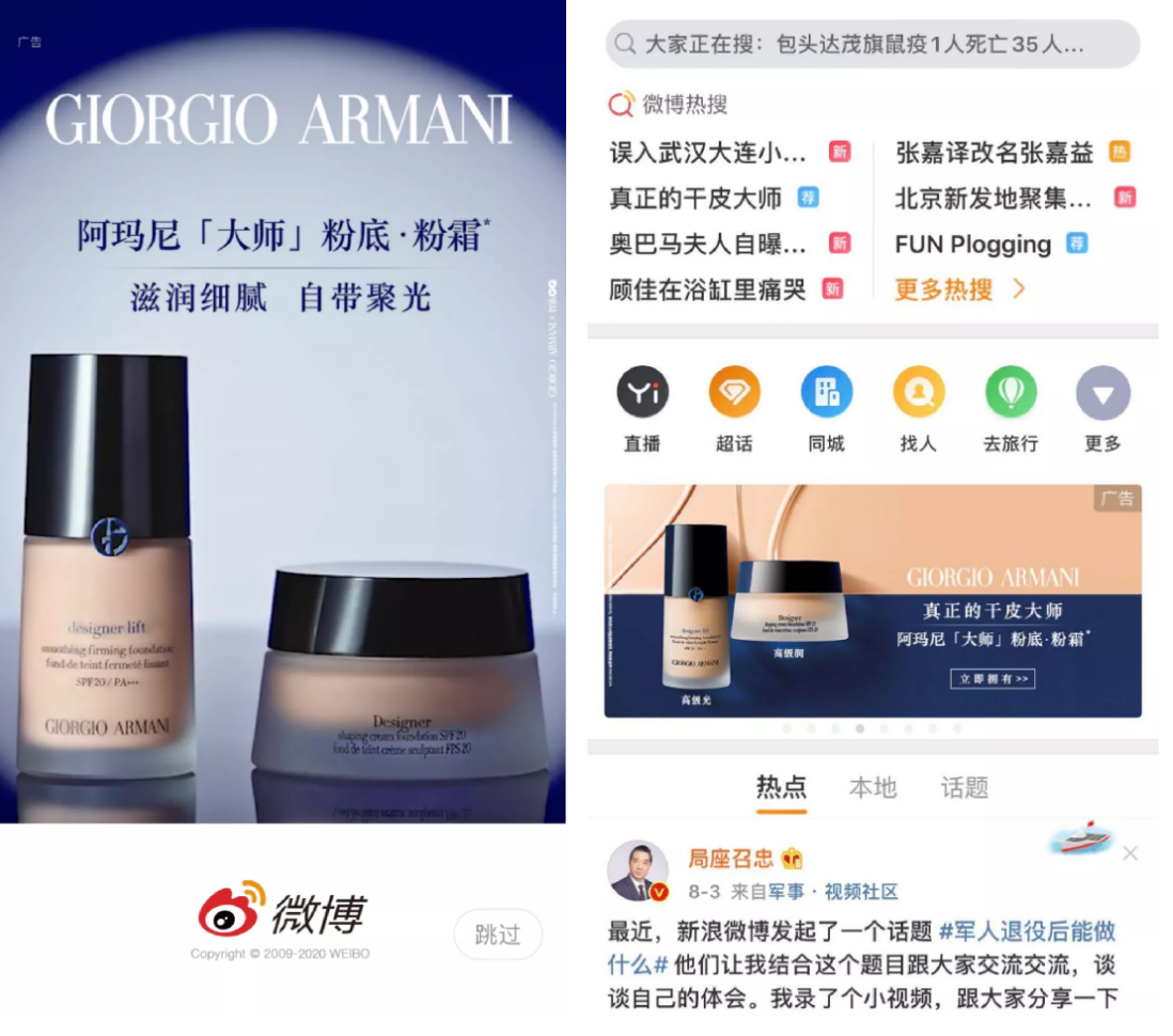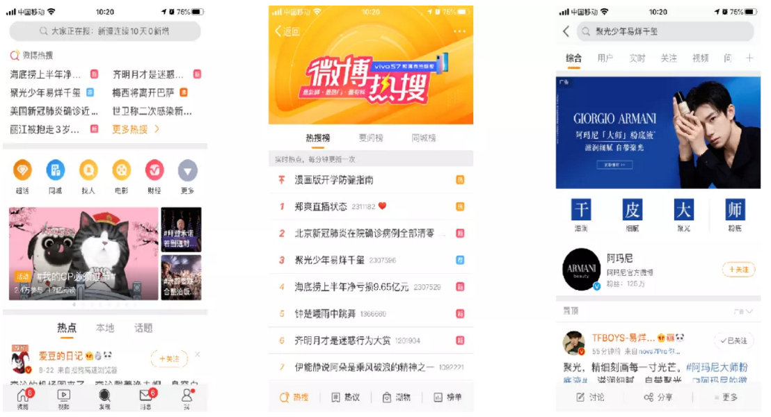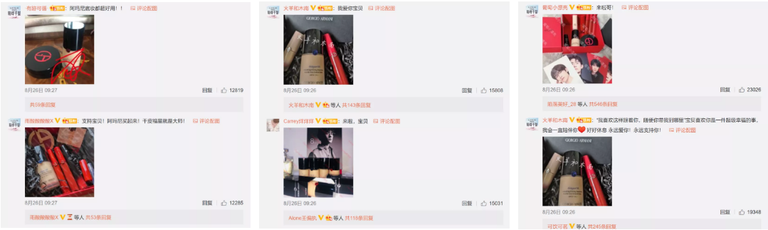 在微博网友对干皮话题讨论的如火如荼时,阿玛尼代言人易烊千玺、钟楚曦接连发布品牌大片,“阿玛尼大师粉底液自带聚光”的产品特点借势明星影响力迅速扩散。