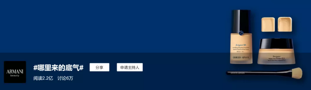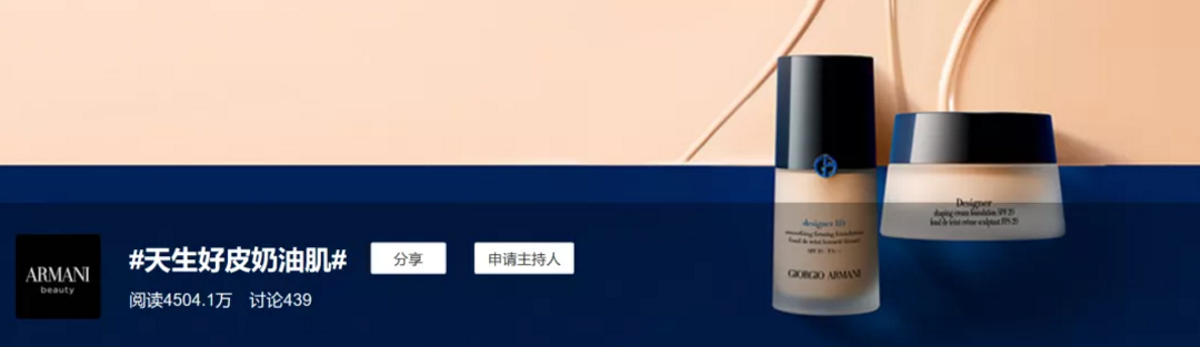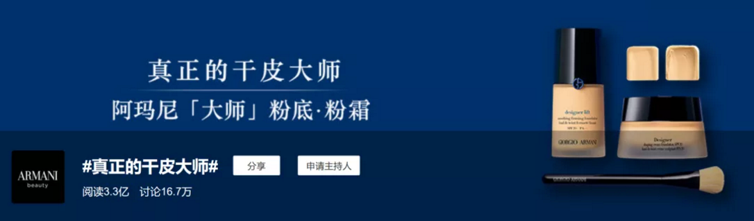 #真正的干皮大师#直接了当,点出阿玛尼大师粉底液的特点;#天生好皮奶油肌#进一步说明产品功效;#哪里来的底气#从社交场景出发,赋予大师粉底液情感价值。三话题联动,从产品到妆效再到场景使用全覆盖,最大化的加深用户对阿玛尼大师粉底液的产品认知。