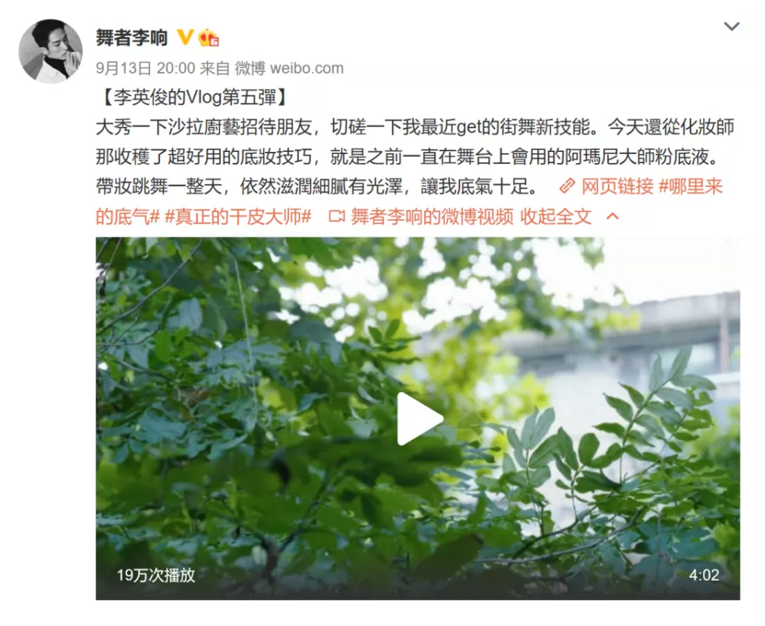 近些年,舞蹈领域关注度逐年攀升,伴随着《舞蹈风暴》节目的热度,古典舞舞者李响的人气不断上涨。@舞者李响 发布VLOG“一直在舞台上会用的阿玛尼大师粉底液。带妆跳舞一整天,依然滋润细腻有光泽,让我底气十足”,将产品特点与态度传达的淋漓尽致。