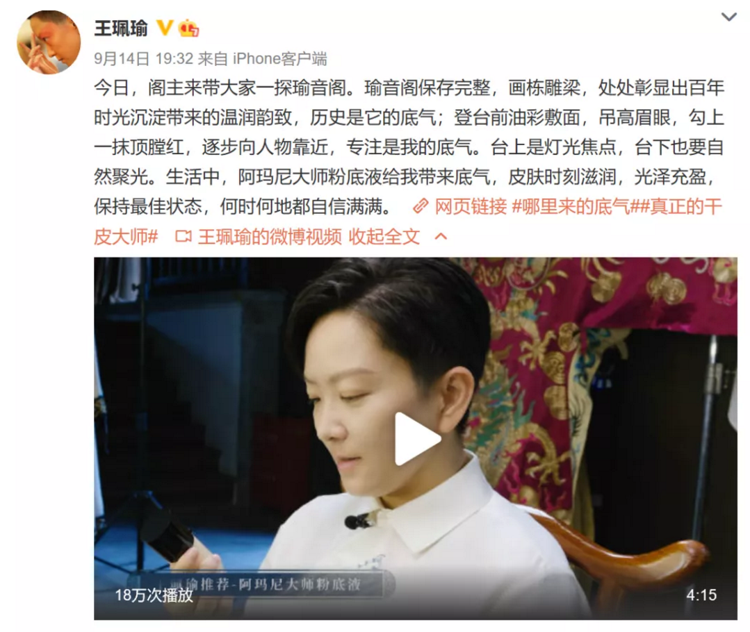 随着戏曲复兴,当之无愧的行业代表京剧大拿王珮瑜也受到越来越多的关注。“瑜音阁保存完整,历史是它的底气;舞台上,专注是我的底气。生活中,阿玛尼大师粉底液给我带来底气,皮肤时刻滋润,光泽充盈,保持最佳状态,何时何地都自信满满。”王珮瑜发布的VLOG覆盖15W+人,使阿玛尼大师粉底液进一步打入京剧票友圈。