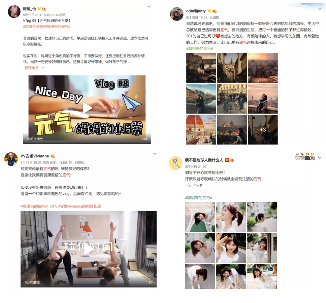 摄影、数码、亲子、健身、美食等各领域KOL纷纷带话题发博,诠释#哪里来的底气#。这些故事引发了用户的共鸣,各圈层用户纷纷加入进来,讲述自己的底气故事,话题页内UGC内容不断。