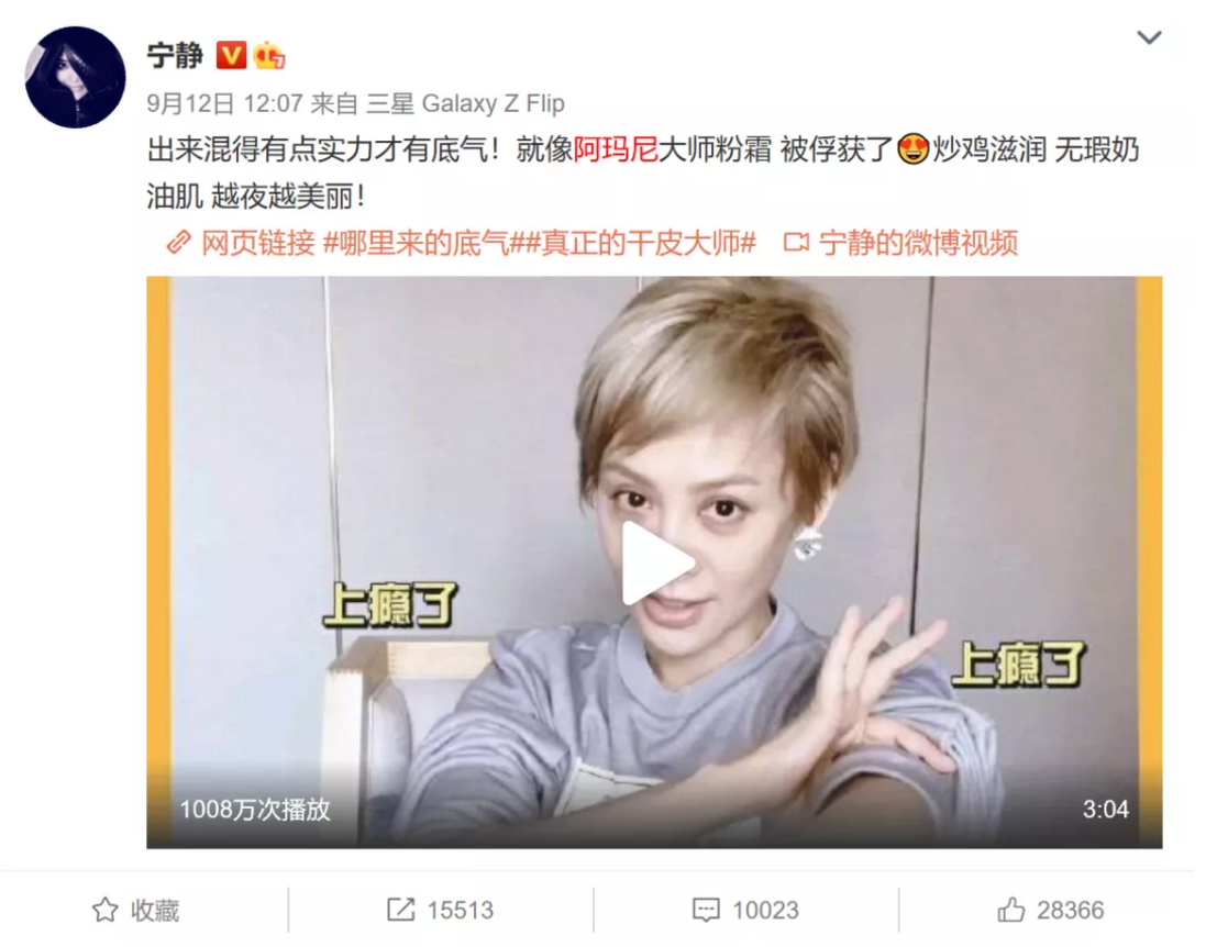 于是,阿玛尼邀请宁静拍摄上妆VLOG,详细说明精致妆容是如何打造的,出来混有实力才有底气。@宁静的VLOG发布后引发了5个层级的传播,播放量高达996W+,粉丝纷纷在评论区应援晒单。而因为宁静今夏的大火,其热度及讨论度覆盖各圈层,也助力了更多非粉人群了解阿玛尼产品。