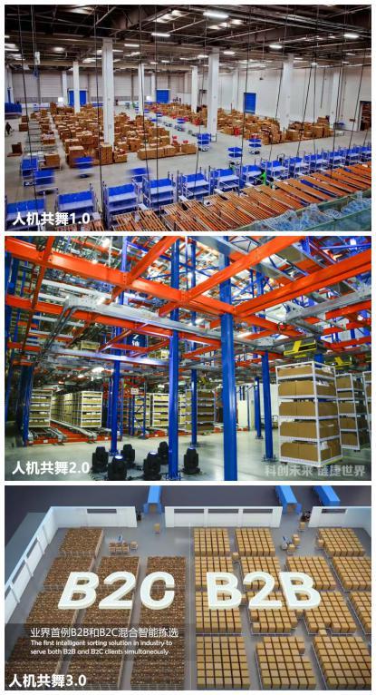 在仓内,科捷的智能化一直在路上。科捷人机共舞1.0的"车到人"模式,让AGV扮演拣货车的角色,用人机接力的方式完成订单的拣选,成功的应用在最高弹性比的双十一大促中,为国内首创。科捷人机共舞2.0,是全球首个悬挂式AGV拣选方案,解决了全自动无人拣选区纵向空间的利用难题。科捷人机共舞3.0,是国内第一个B2B/B2C双业务混合AGV拣选方案。一系列自主知识产权的黑科技,让仓内运作更智能高效。