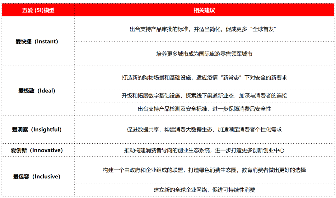 我们对推动中国美好消费的政策建议建立在以下五大支柱之上,我们称之为“五爱 (5I)”:“爱快捷(Instant)”、“爱极致(Ideal)”、“爱洞察(Insightful)”、“爱创新(Innovative)”及“爱包容(Inclusive)”: