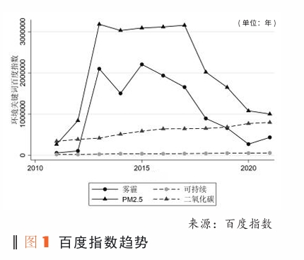核心解释变量为公众对环境的网络舆论强度。本文采用公众在百度上对特定关键词经过加权过滤算法处理的检索频繁度——百度指数,来衡量公众对环境的关注度。如图1,公众对雾霾、PM2.5关键词的搜索在2011—2017年出现持续上升的趋势并保持较高的频率,对以“可持续”“二氧化碳”为例的宏观概念关键词的搜索量平稳上升。由此可见,指向性明显的环境相关关键词的搜索量较容易受政策、突发事件等影响出现大幅波动,而概念类关键词则搜索量较为平稳。本文采用2011—2020年各地级市“低碳”“环境保护”“去污”“减排”“净化”“可持续”等关键词的百度指数,将上市公司所在地级市的关键词百度指数+1取对数,作为该上市公司衡量公众环境关注的指标,百度指数数值越大,公众对环境的网络舆论强度越高。研究前对相关变量进行了1%和99%水平上的缩尾处理。
