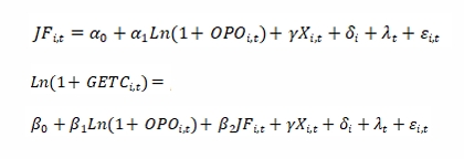 在上述方程式中,下标i和t分别表示企业和年份。GETCi,t代表企业的绿色技术创新水平,OPOi,t代表企业所在的地级市的公众环境关注,β1给出了网络舆论对绿色技术创新的效应估计,Xi,t表示企业层面的控制变量,δi表示行业固定效应,λt表示年份固定效应,εi,t是随机误差项。其中JFi,t为Janis-Fadner系数,代表企业的组织合法性水平。