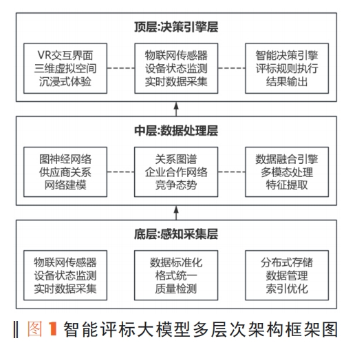 多层次模型架构把元宇宙虚拟仿真技术与数字孪生理念相融合,构建出沉浸式智能评标决策环境。架构底层采用物联网传感器网络来实时采集设备运行状态数据,中间层运用图神经网络技术构建供应商关系图谱,将企业间的合作网络、技术传承关系及市场竞争态势做可视化建模,顶层决策引擎集成虚拟现实交互界面,评标专家能在三维虚拟空间中直观查看技术方案、检验设备模型及模拟项目实施过程。如图1所示,整个架构通过感知采集层、数据处理层及决策引擎层的三层递进式设计,实现从底层数据感知到顶层智能决策的完整技术链路。架构创新性引入量子计算模拟器,利用量子并行计算特性,加速复杂评标规则的组合优化求解,让评标过程从二维文档审阅升级为三维沉浸式体验。