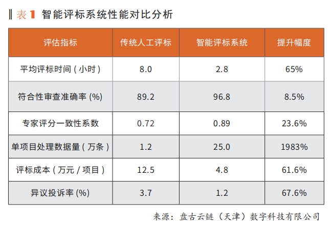 智能评标大模型平台在某电力企业的实际部署应用中展现出显著的性能提升效果,通过对传统人工评标模式与智能化评标系统的对比分析,验证了大数据驱动下智能评标技术的实用价值及应用前景。通过表1数据分析可以发现,智能评标系统处理大规模数据展现了传统模式难及的优势,尤其在数据处理能力上实现近20倍的跃升,这得益于分布式计算架构及智能算法深度融合应用。系统在保证评标质量前提下大幅缩短了评标周期,专家评分一致性显著改善,说明智能辅助评审功能减少了主观判断差异,异议投诉率大幅下降充分证明了智能评标系统提升了采购公平性及透明度。