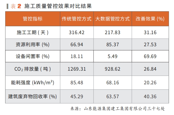 表2数据显示,大数据管控方式在施工效率及环境效益方面均实现显著改善,施工工期从316.42天缩短至217.83天,工期缩短31.16%,资源利用率从66.94%提升至85.37%,设备闲置率从18.11%降低至5.49%,降幅达69.69%。环境效益方面,CO2排放量从1269.31吨减少至928.62吨,26.84%的减排效果及能耗强度20.26%的降低,证明了数据驱动的施工能耗优化策略的有效性,建筑废弃物回收率40.36%的提升,展现了智能分类回收管理系统的应用价值。