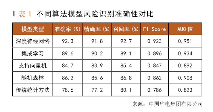 财务风险识别准确性评估基于大型电力集团数字化转型项目及区域供热企业智慧能源管理平台的实际应用场景。深度学习模型在混淆矩阵分析中展现出了十分优异的分类性能,其F1-Score达到了0.923,且精确率与召回率均保持在较高水平,ROC曲线下面积AUC值为0.951,显著超越传统统计学方法的0.786,多模态神经网络融合结构化财务数据与非结构化文本信息,特征提取能力较单一数据源提升32%。如表1所示,不同算法模型在风险识别准确性方面存在着显著差异,集成学习框架通过投票机制有效降低了单一模型的误判风险,将假阳性率控制在3.2%以内,量子计算优化的参数调节策略缩短了模型训练时间,使计算效率提升45%。自适应阈值调整算法根据市场环境变化实时优化分类边界,提升模型对异常风险模式的识别敏感度。