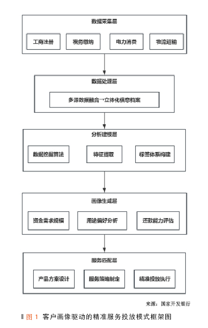 银行客户识别长期受制于财务报表和抵押资产等有限信息源,难以准确把握客户真实经营状况,多源数据融合技术为解决这一问题提供了新路径,工商注册、税务缴纳、电力消费及物流运输等异构数据的整合,形成了立体化客户信息档案。全景式数据采集突破了单一维度评估的束缚,使银行能够深入洞察客户经营轨迹和行为特征,数据挖掘算法从海量信息中提取关键特征变量,建立个性化的客户标签体系,发展“千人千面”的细分模式,精准画像技术识别不同客户的资金需求规模、用途偏好及还款能力,进而设计相应的产品方案和服务策略,这种模式建立了客户需求与银行供给的匹配机制,形成了从需求识别到产品投放的完整链条,通过数据驱动的方式重新定义了银行与客户的服务关系(如图1所示)。
