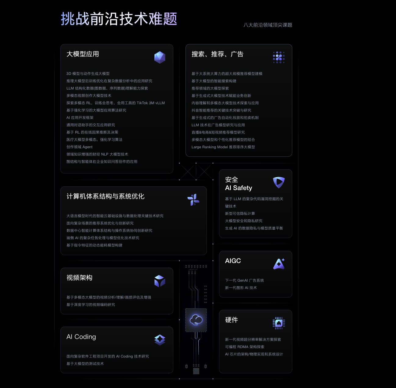 相关招聘计划的官网显示,本次招聘涵盖大模型应用、搜索/推荐/广告、计算机体系结构与系统优化、安全/AI Safety、硬件、AI Coding、视频架构、AIGC等8大领域;向目标招聘群体开放的课题数量由2024年的31个增加至42个。这些课题分布在学术研究和科研应用两个方向,支持成果发表,也有丰富的场景可以落地。