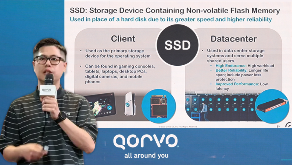 面对AI算力爆发对数据中心存储的严苛需求,Qorvo推出集成PLP功能的PMIC(电源管理集成电路)解决方案,重点支持企业级SSD(固态硬盘)应用。张俊岳指出,AI训练与推理推动SSD向更高传输率(如PCIe 5.0)、更强可靠性及掉电保护演进,而Qorvo的ACT85411和ACT85611系列芯片通过多模块集成(逻辑控制电路、先进的存储电容健康监测、MTP(多次重复擦写)功能)减少元件数量,提升存储密度与能效。