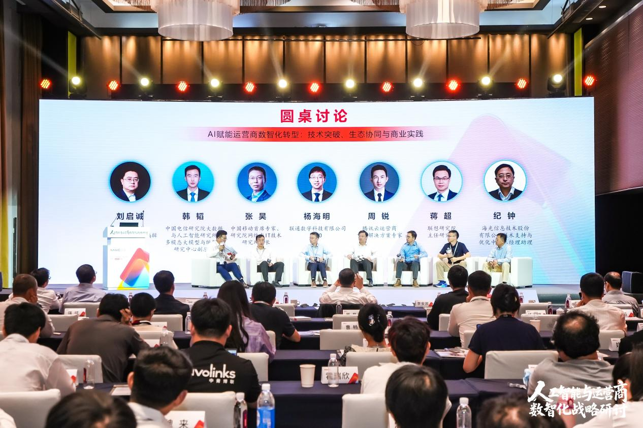 在圆桌环节,中国电信研究院大数据与人工智能研究所多模态大模型与编解码研究中心副总监韩韬,中国移动首席专家、研究院网络与IT技术研究所所长张昊,联通数字科技有限公司CTO杨海明,腾讯云运营商首席解决方案专家周锐,联想研究院主任研究员蒋超和海光信息技术股份有限公司技术支持与优化中心总经理助理纪钟六位行业领袖共聚圆桌,以“技术突破、生态协同与商业实践”为锚点,解码AI与通信行业的融合密码,展开了深入探讨,分享了各自的见解和实践经验,共绘数智化转型的全景蓝图。