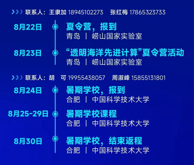 除核心课程外,本届暑期学校特别增设"透明海洋先进计算"夏令营环节(由崂山国家实验室承办),将从前述学员中选拔,于正式课程开始前赴青岛参与为期两天的深度研讨与实践活动。只参加暑期学校的学员直接赴合肥中国科大报到。