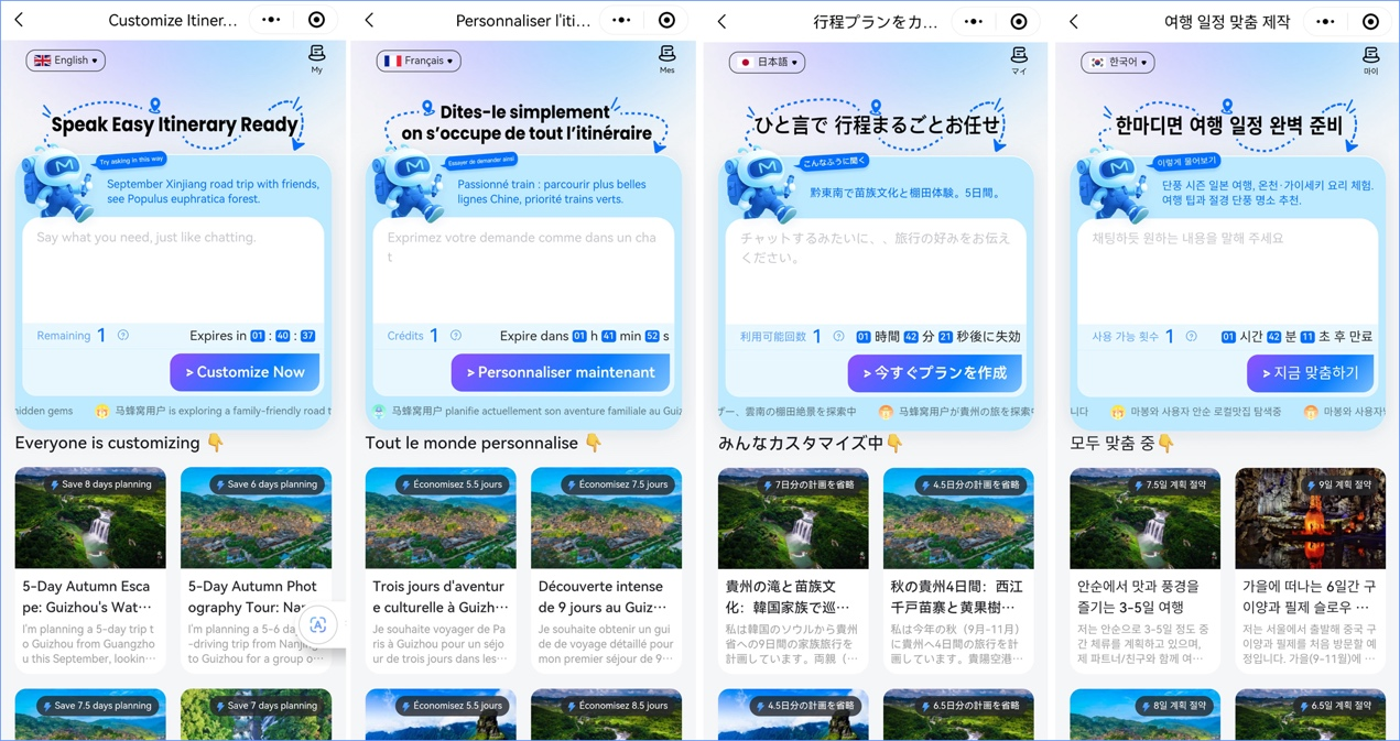 作为全国首个景区专属AI服务集成平台,“AI游西江”的证件核验功能首创“分级审核+异常行为识别”双机制,覆盖学生、教师等5类高频优惠人群,将人工抽检比例降至15%,核验效率提升3倍。新增的一键投诉入口建立“线上提交-电话回访-后台追踪”三级处理流程,将平均响应时长从48小时压缩至4小时。“AI游贵州”平台则立足全省,提供更广泛的智慧服务。升级后的多语言 “AI行程定制”功能,支持外语输入与多语种行程生成,入境游客可直接使用母语获取定制化行程方案,有效解决外国游客在贵州的语言障碍问题,提升国际化服务水准。