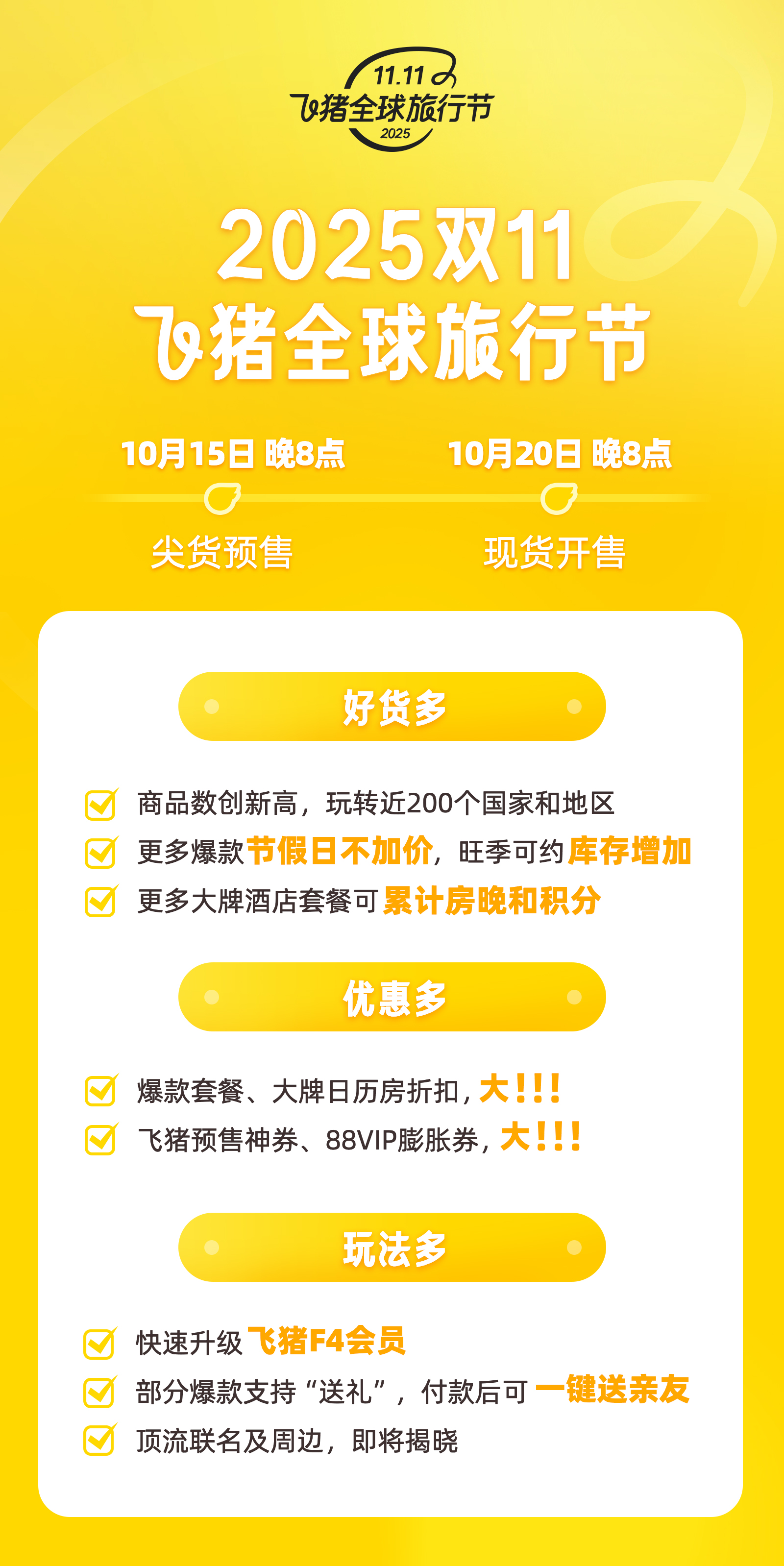 【雷竞技app下载安卓 讯】10月15日消息,飞猪宣布2025年双11全球旅行节启动,其中尖货预售于当日晚8点开始,全量现货将于20日晚8点开始。