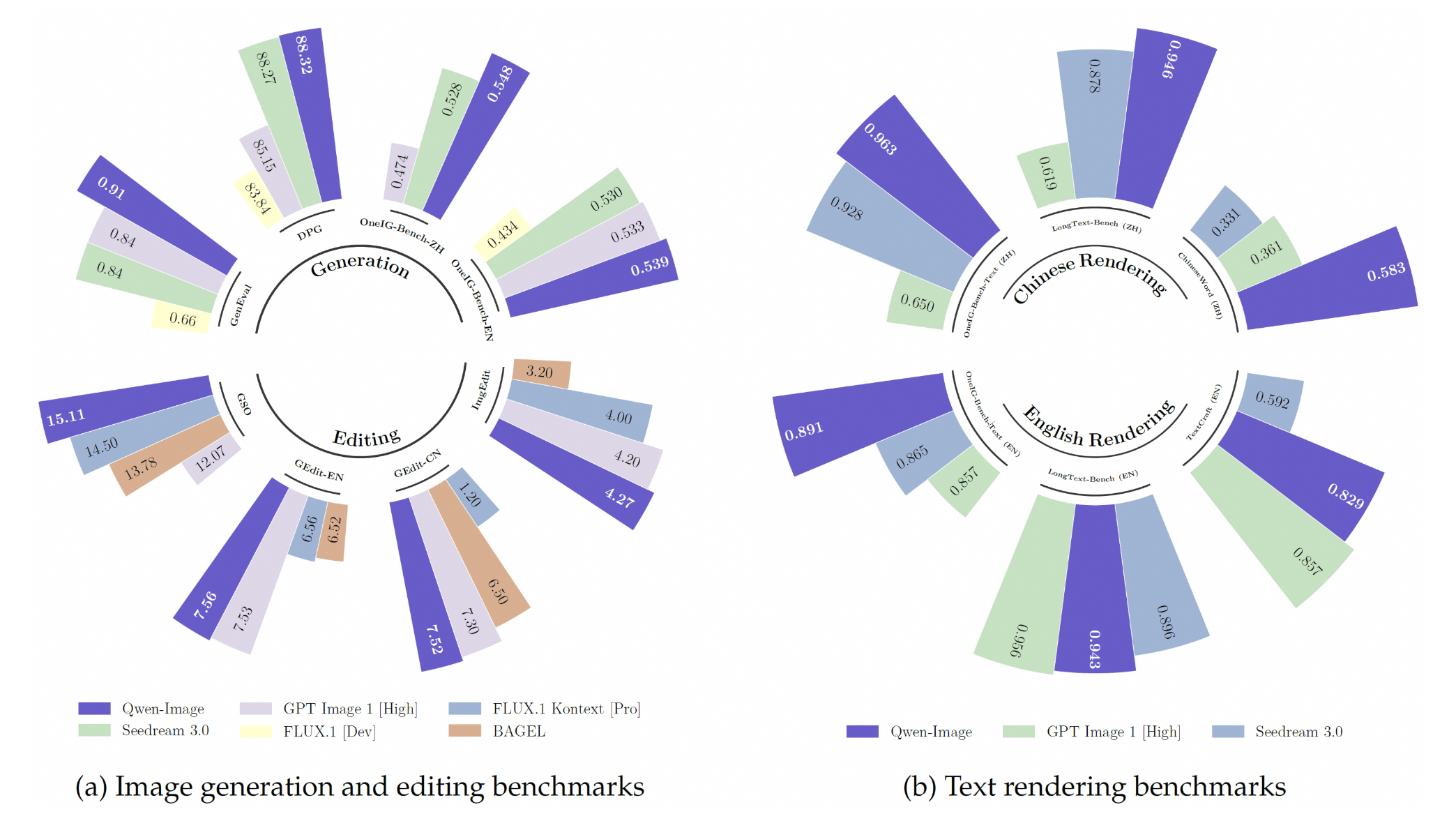 此前,Qwen-Image基础版在用于通用图像生成的GenEval、DPG和OneIG-Bench,以及用于图像编辑的GEdit、ImgEdit和GSO等多个基准测试中均取得了最先进的性能,展现出其在图像生成与图像编辑方面的强大能力。此外,在用于文本渲染的LongText-Bench、ChineseWord和TextCraft上的结果表明,Qwen-Image在文本渲染方面表现尤为出色。