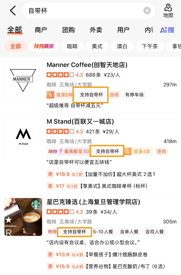▲商家可在线上展示支持自带杯及优惠等信息(图源:大众点评App截图)