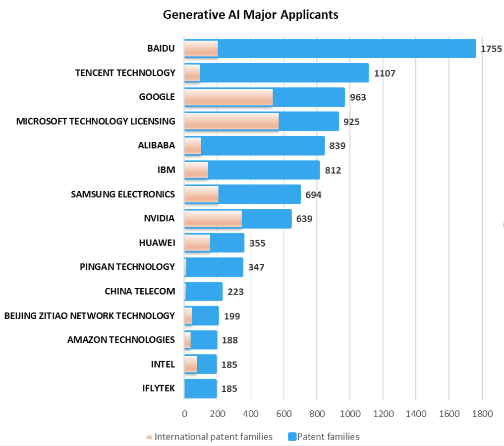Questel报告显示,在生成式AI专利领域,百度以1755件相关专利申请量登顶全球榜首,成为生成式AI技术演进的关键推动者。