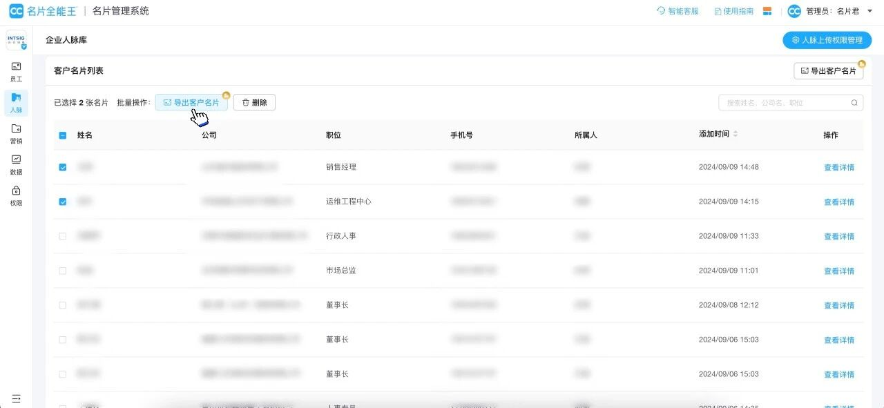 图说:管理员可在企业数字名片管理后台查看、管理人脉库