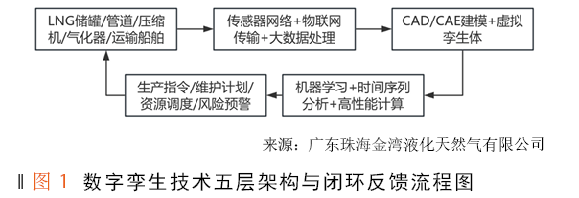 数字孪生技术为LNG工程建立起物理实时的数字化映射,重构了项目全周期的价值实现路径,该技术架构涵盖数据采集、模型开发、模拟优化及落地应用四个层面。通过物联网设备实时采集温度、压力、流量等运行参数,借助计算机辅助设计和工程分析技术精准还原设备结构特征与运行规律。模拟阶段采用机器学习方法建立故障诊断模型,利用时序分析技术预判生产状态的演变趋势。应用层把优化方案转化为可执行的生产指令,构建“实体 - 数据 - 决策”的闭环管理机制,助力LNG工程从经验主导模式向数据驱动模式转型,如图1所示。