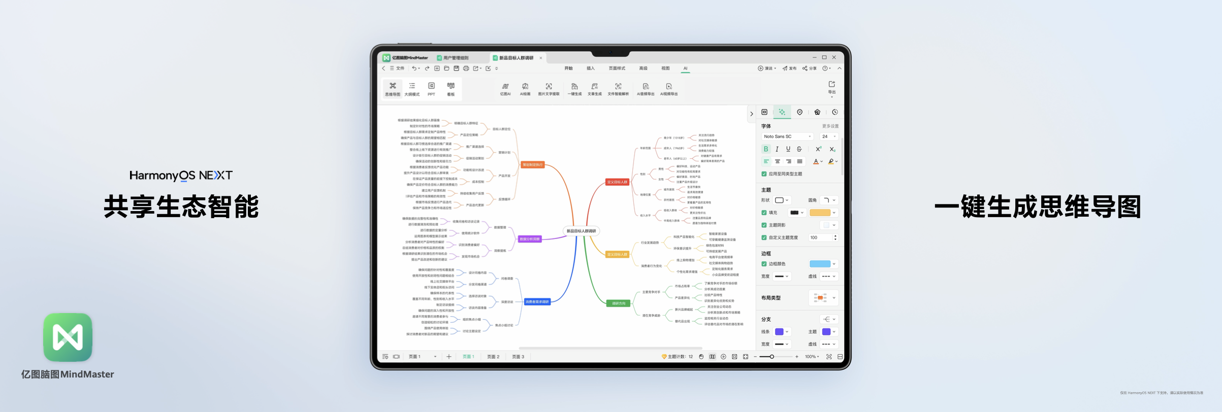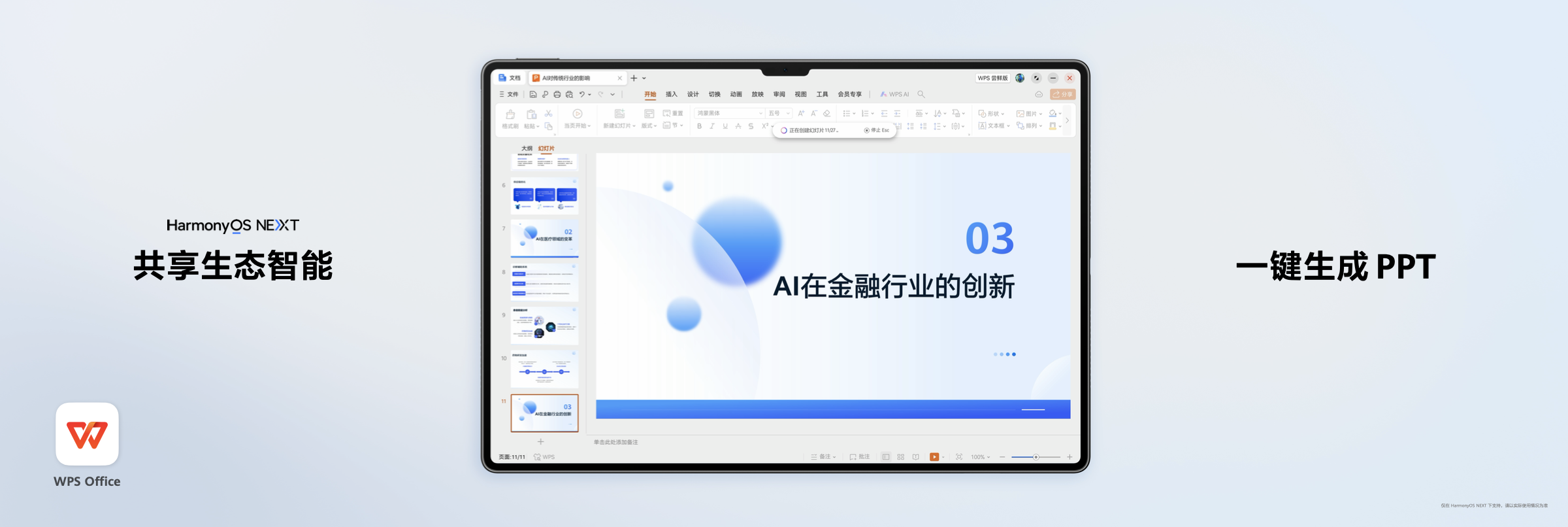 应用生态层面,HarmonyOS NEXT也为平板办公、创作生态带来了革新,为全新HUAWEI MatePad Pro 13.2 英寸带来了多款鸿蒙原生办公软件。用户在平板上可直接运行WPS Office 鸿蒙版、海泰浏览器 鸿蒙版、亿图脑图MindMaster 鸿蒙版、亿图图示 鸿蒙版以及中望 CAD鸿蒙版等桌面级办公应用。以WPS Office 鸿蒙版为例,当个人账户拥有相应权益时,可实现AI生成PPT等能力,为用户提供更智能更高效的办公体验。全新亿图脑图MindMaster鸿蒙版同样1:1还原了桌面级体验,将带来全量绘图功能和强大的AI能力,用户只需输入关键词,便可生成一份完整的思维导图。中望CAD鸿蒙版拥有与桌面端一致的功能面板,在平板终端即可实现流畅看图、多端协同,更可通过键鼠操作完成各类复杂的工业设计工作。