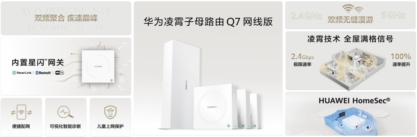 凌霄子母路由 Q7 网线版从网络速度、网络覆盖率、设备互联、网络安全等多方面解决了大户型家庭用网的难题,真正实现了让每个房间都能享受到满格信号。