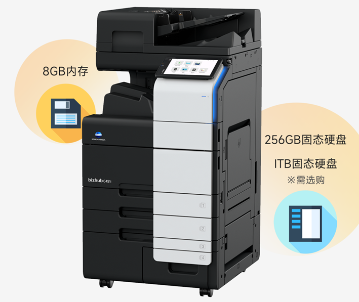 bizhub C451i配备了8GB内存和256GB硬盘可充分保障设备稳定运行