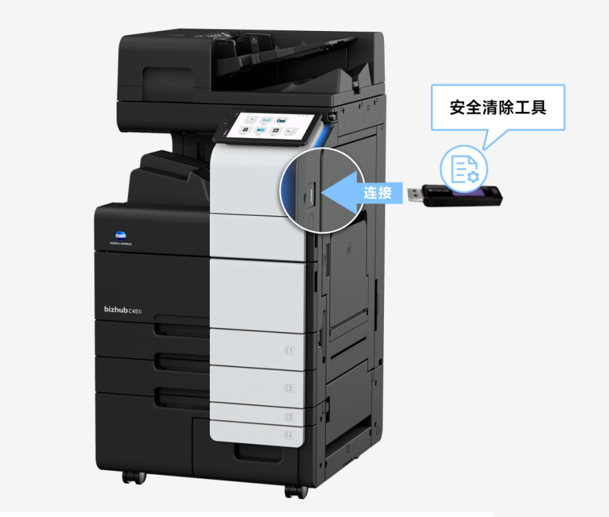 此外,bizhub C451i所标配的256GB加密固态硬盘,不仅可提供大容量的存储空间,更可确保数据在存储过程中的安全性。同时,柯尼卡美能达还设计了硬盘完全清除工具,通过该工具能彻底删除硬盘内的所有信息数据以有效规避设备在替换或报废时可能引发的数据安全隐患。