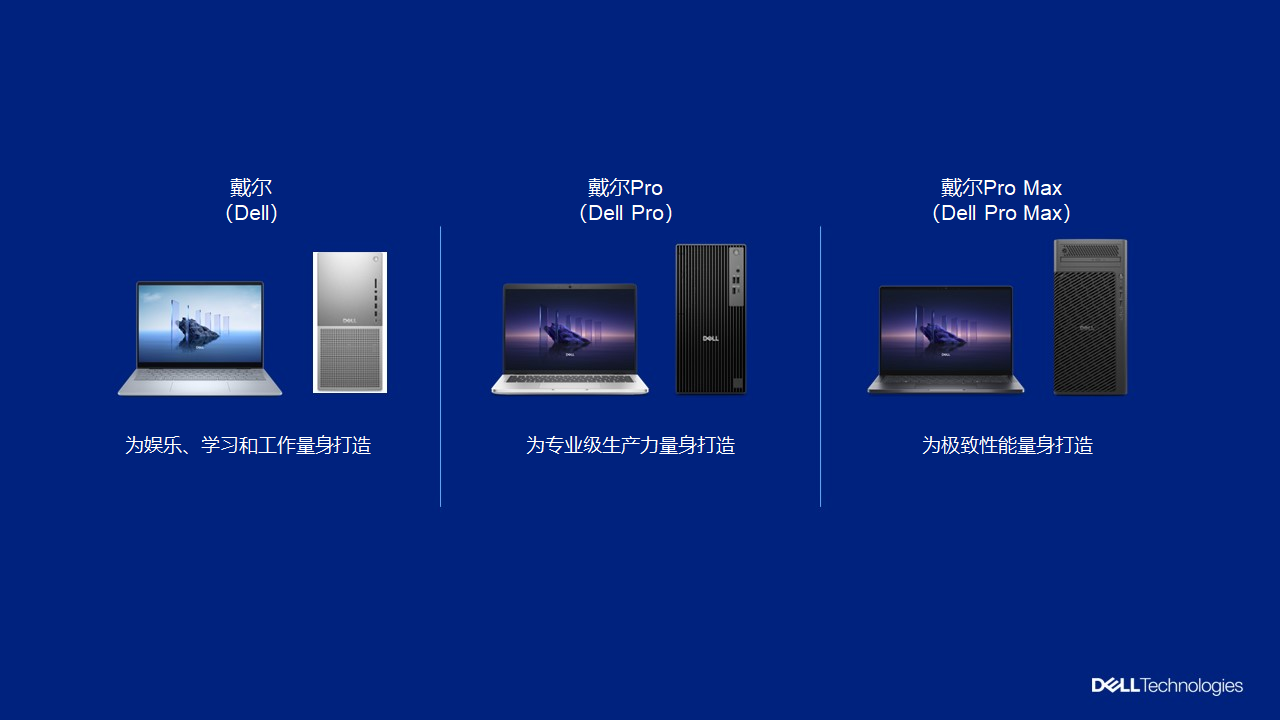 PC市场正经历快速变革。芯片创新正处于强盛时期,无论是IT决策者、专业人士还是普通用户,都在寻求设备端AI技术的助力,期待可以提升生产力与创造力。为帮助客户轻松选择匹配的PC,戴尔科技聚焦用户核心需求,推出三大简明的产品类别:戴尔(Dell)(为娱乐、学习和工作量身打造)、戴尔Pro (Dell Pro)(为专业级生产力量身打造)和戴尔Pro Max (Dell Pro Max)(为极致性能量身打造)。