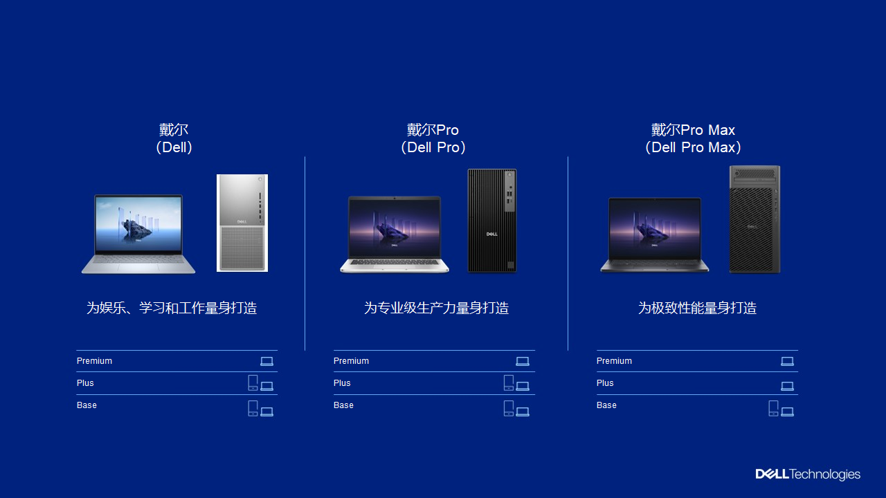 为了让每个新品类别中的产品易于区分,戴尔科技采用了一致的分级方法,让用户可以根据自己的具体需求准确选择相应的设备。每个类别的产品在Base型之上,还提供具有可扩展性能的Plus型,以及具有极致移动性和设计的Premium型。