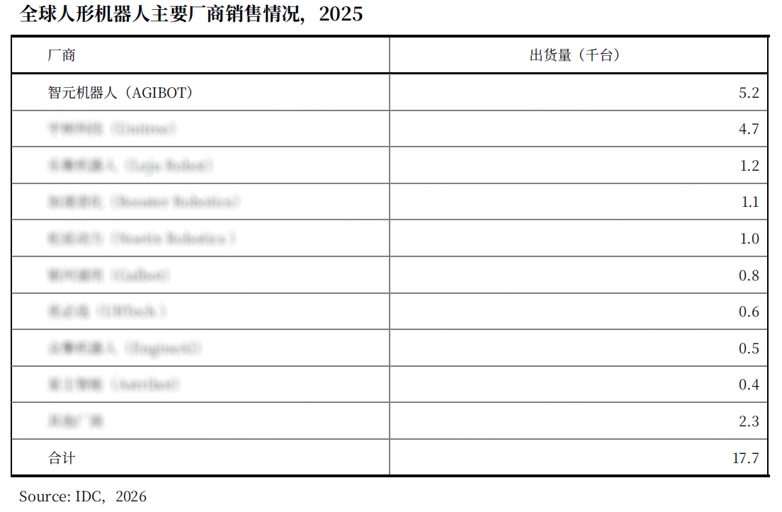 根据IDC数据,2025年全球人形机器人出货量约1.8万台,同比增长约508%,中国厂商占主导,智元以5,200台的出货量稳居全球榜首,市场份额显著领先。这一数据标志着智元不仅完成了从技术研发到产品量产的关键跨越,更在规模化交付这一硬性指标上体现了优势,确立了在全球市场的领导者地位。
