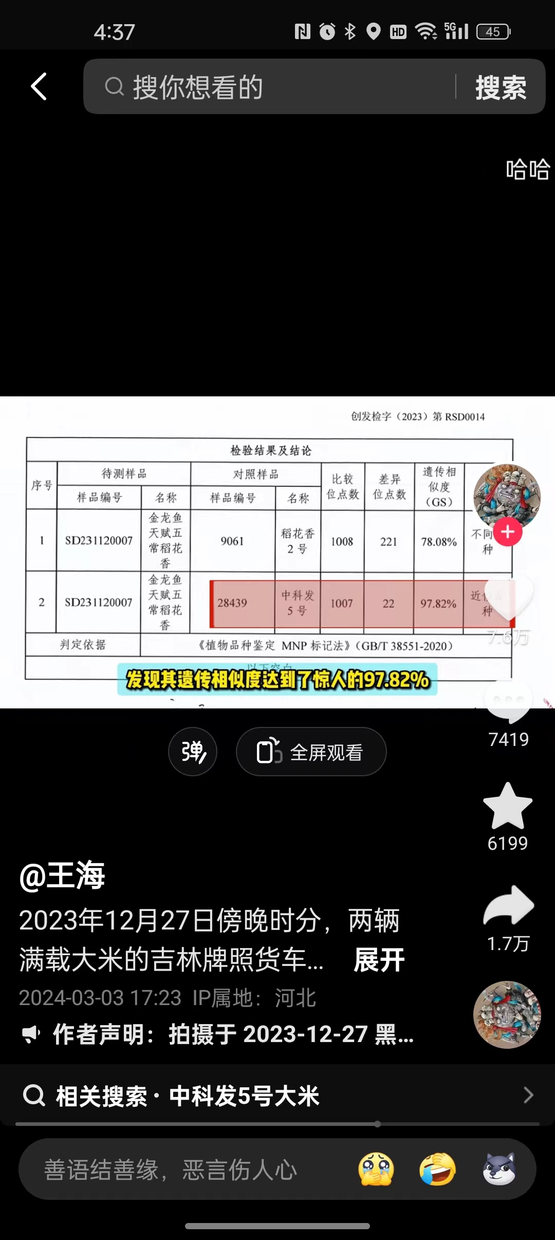 我们在王海发布的视频中看到,视频开头有两辆吉林牌的货车驶入位于黑龙江省五常市的阔海武昌米业有限公司,据货车司机透露,其车上大米均为外地米,俗称“发五”,即“中科发5号”。阔海武昌米业有限公司是金龙鱼的米业代收代储点,其精米会经金龙鱼销往全国各地。