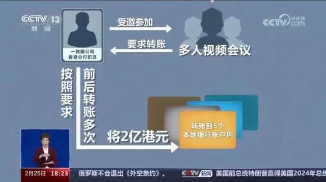 在这起案件中,一家跨国公司香港分部的职员受邀参加总部首席财务官发起的“多人视频会议”,并按照要求先后转账多次,将2亿港元分别转账15次,转到5个本地银行账户内。这起案件中所谓的视频会议中只有受害人一个人是“真人”,其他“参会人员”都是经过“AI换脸”后的诈骗人员。