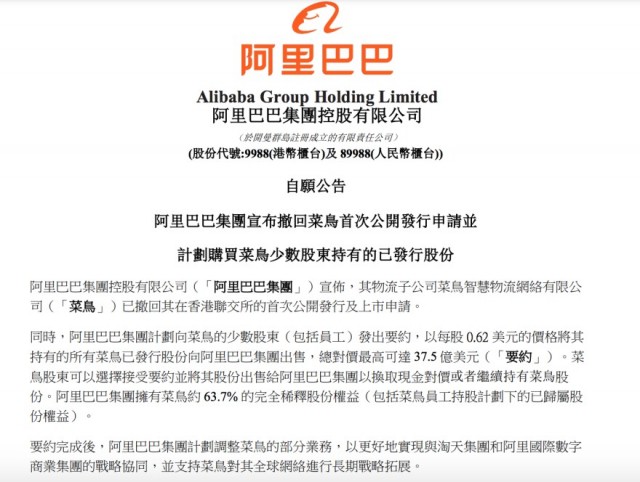 今日晚间,阿里巴巴在港交所发布公告,宣布其物流子公司菜鸟智慧物流网络有限公司已撤回其在香港联交所的首次公开发行及上市申请。