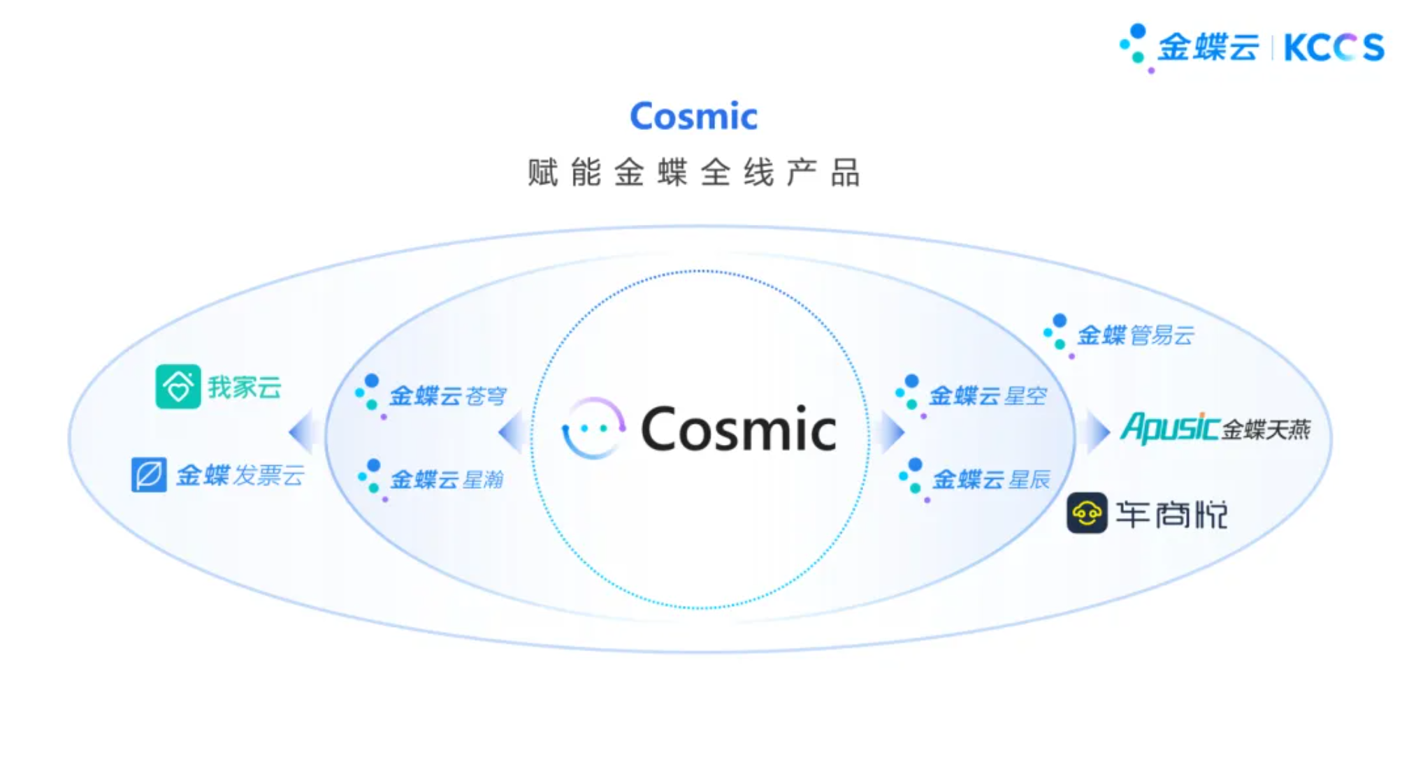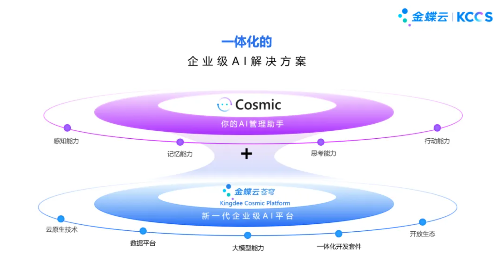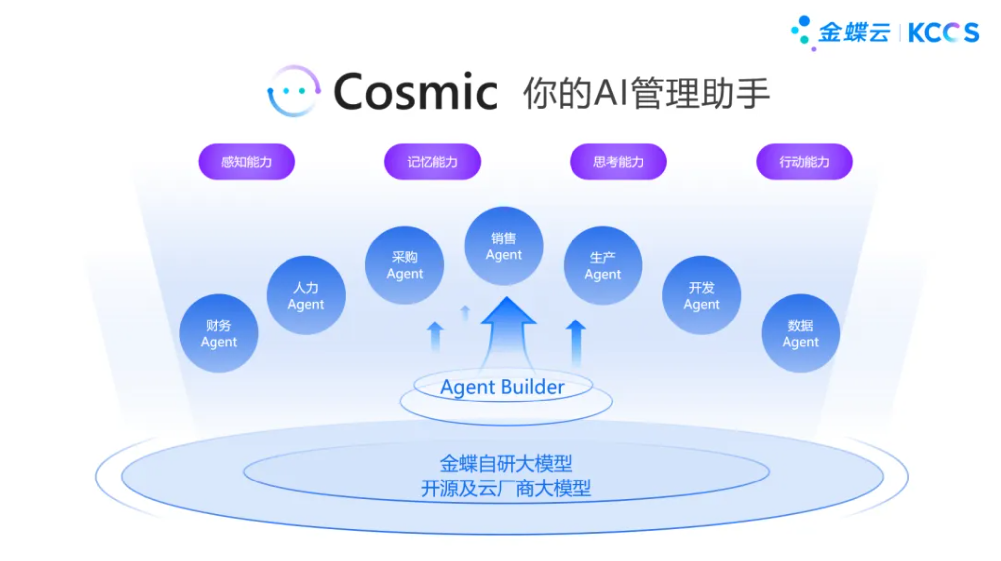 Cosmic作为面向企业用户的超级智能AI管理助手,具备感知、记忆、思考和行动四大核心能力,能够智能地理解用户在财务、人力、采购、开发等场景需求,通过统一的金蝶云 ·苍穹平台赋能到金蝶全系列产品,从管理者,专业人员,到普通员工,Cosmic为每个用户都提供个性化的智能助手解决方案。