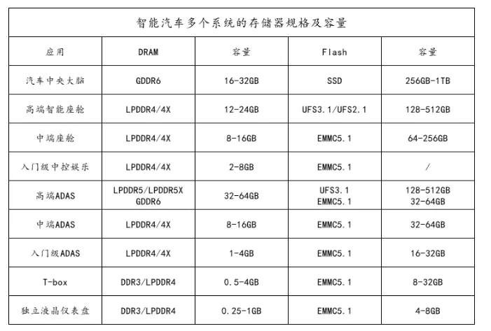 智能汽车多个系统的存储器规格及容量(数据来源:CFM闪存市场)
