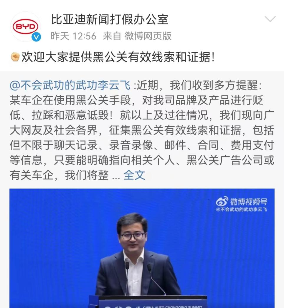 6月19日,比亚迪品牌及公关处总经理李云飞在微博发文,面向社会公开征集黑公关证据。