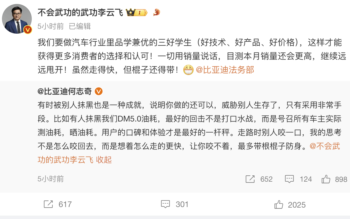 微博中,李云飞写道:“近期,我们收到多方提醒:某车企在使用黑公关手段,对我司品牌及产品进行贬低、拉踩和恶意诋毁”。
