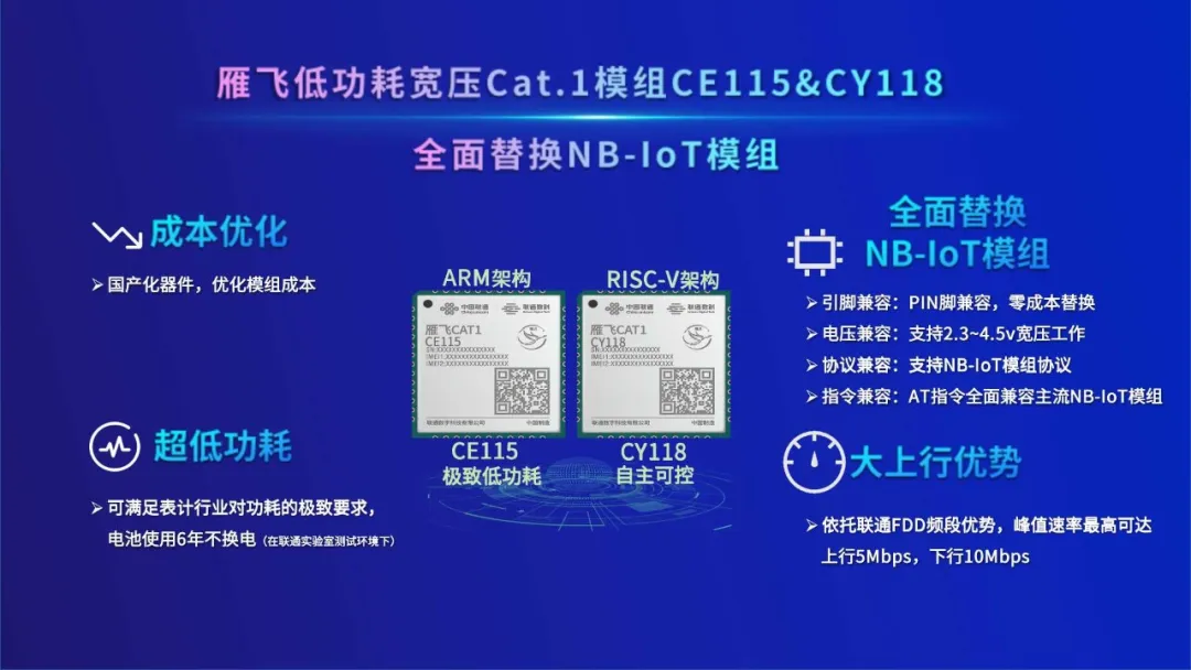 在芯模打造方面,我们深度定制了CUIoT-S101、CUIoT-S102两款高性能芯片,分别基于ARM与RISC-V架构,通过融入格物平台SDK与格物OS,成功构建物网协同,网业协同、端云高效互通3大差异化优势。为进一步赋能物联网应用,我们基于雁飞定制芯打造了具有极致低功耗优势的CE115和自主可控优势的CY118两款雁飞低功耗宽压Cat.1模组,完美替换主流NB-IoT模组。首先,该模组通过定制芯片及器件自主选型实现成本优化;其次,针对能源表计等重点行业进行低功耗优化;再者,通过引脚兼容、电压兼容、协议兼容、指令兼容等设计,实现全面替换NB-IoT模组,为客户提供零成本迁移方案,雁飞低功耗宽压Cat.1模组更是以超低价11.99元震撼市场。