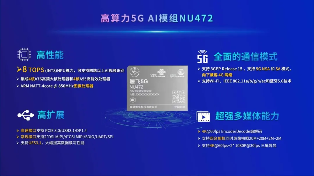 面向边缘计算与AI融合的未来,联通数科物联网打造首款雁飞高算力5G AI模组。该模组采用“5G基带+边缘NPU算力”架构,具备8 TOPS NPU算力和AI算法模型本地执行、判断、决策能力,能够满足人脸识别、语音识别、移动侦测的多种算法的资源需求。同时模组内置Wi-Fi、蓝牙、GNSS定位等能力,具备多种类型外设接口以及4K超高清视频的处理能力,首发价780元,完美适配AI家庭网关、工业PDA、车载智能驾舱等行业终端。
