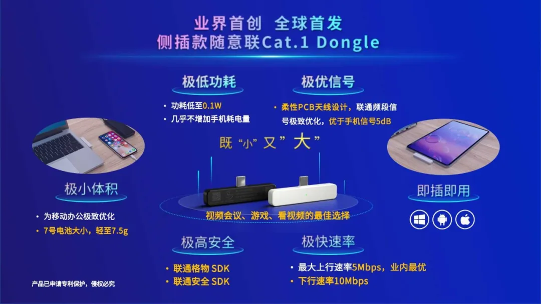 在终端赋能方面,联通数科物联网雁飞数传产品体系全面焕新升级,完成从场景突破到创新引领的飞跃,实现业界领先的全场景全速率产品矩阵。在5G数传产品方面,前期已发布10款5G数传产品。在4G数传产品方面,本次重磅发布业界首创侧插款雁飞随意联Cat.1 Dongle产品。既“小”又“大”为本产品的特色,即在极致小体积内实现功耗、信号、散热等最优。产品内置联通安全SDK,提供可信联网保障,侧插款外形更是专为移动办公场景设计,提供最优使用体验。尤为值得一提的是,该款产品首年套餐含流量服务,仅需199元,性价比超乎想象,是远程会议、在线游戏和观看视频的最佳选择。