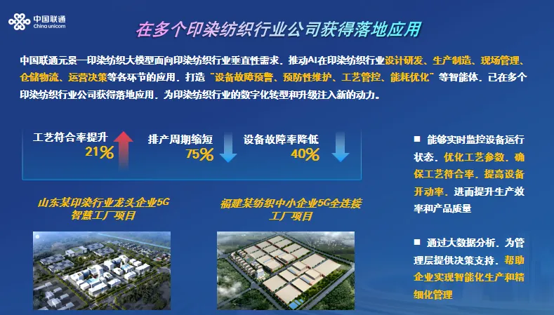 比如,山东某龙头印染企业,通过使用联通数科物联网打造的印染大模型,实现了工艺符合率从67%提升至98%,排产周期缩短75%,设备故障率降低40%,为企业的智能化生产和精细化管理提供了有力支撑。