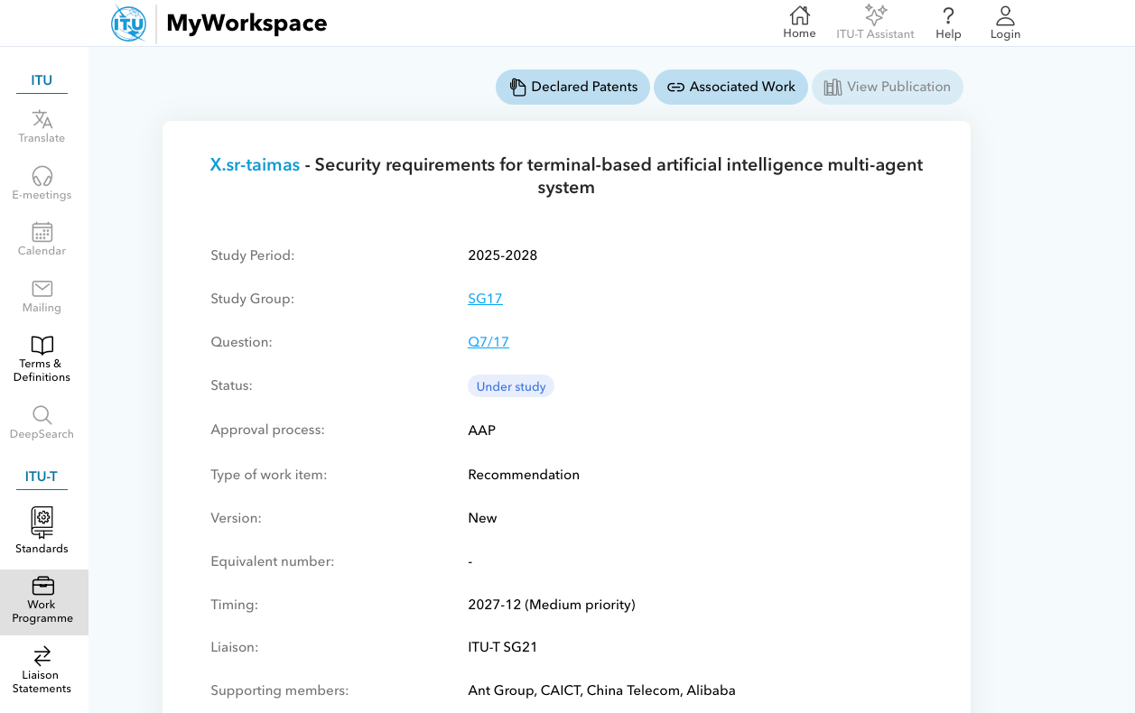 【雷竞技app下载安卓 讯】在近日于瑞士日内瓦落幕的国际电信联盟(ITU)电信标准化部门(ITU-T)第17研究组会议上,为响应《关于共建终端智能体生态的倡议》,由蚂蚁集团牵头,联合中国信息通信研究院泰尔终端实验室、中国电信等单位共同提出的《终端多智能体系统可信要求》国际标准项目(以下简称“标准”),经全会审议一致通过,正式成功立项。