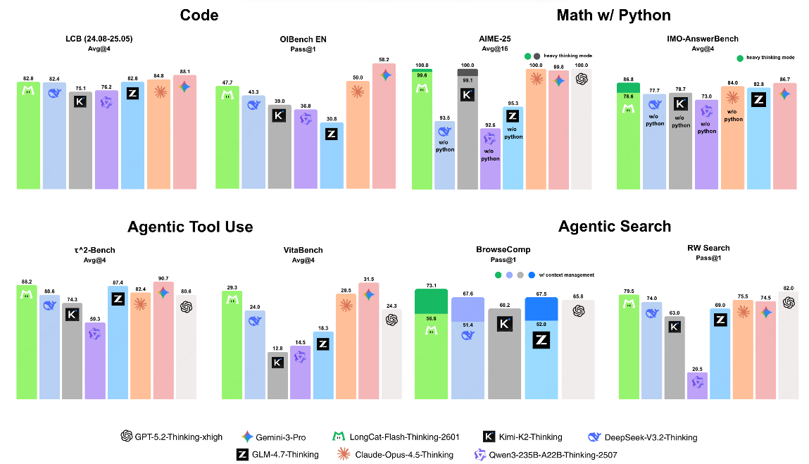 经过全面严谨的评估,LongCat-Flash-Thinking-2601模型在编程、数学推理、智能体工具调用、智能体搜索等维度表现优异: