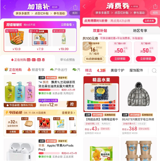 ▲从拼多多首页进入百亿补贴,分别点击加倍补专区、消费券专区即可参与活动。