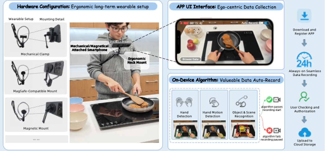 【雷竞技app下载安卓 讯】3月3日消息,近日,具身智能真实数据采集技术取得重要突破。由蚂蚁数科天玑实验室团队研发的AoE(Always-On Egocentric)持续性第一人称视频采集框架,提出了一种轻量化且低成本的具身数据采集方案。通过一台手机和一个低于20美元的颈挂式支架,就可以替代动辄数万美元的专业设备,实现具身智能的高质量数据采集。该技术方案的提出,有效化解了具身数据采集成本高、规模化难的困局。目前,这一技术论文已经在Arxiv发布。